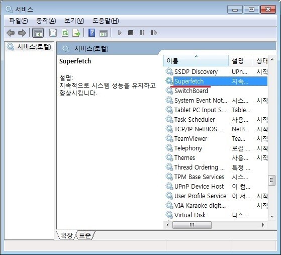 - ‘서비스’에서 ‘Superfetch’를 찾고 ‘정지’를 선택한 후, 컴퓨터를 다시 시작합니다.